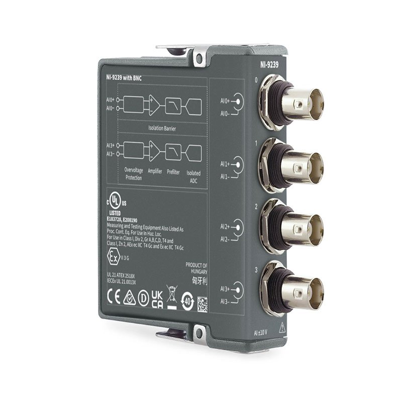 The NI‑9239 performs differential analog input. With channel‑to‑channel isolation, your entire system, including the device under test, is protected from harmful voltage spikes up to the isolation rating. In addition to safety, isolation eliminates measurement errors caused by ground loops because the front end of the module is floating. Designed for both speed and accuracy, the NI‑9239 is an effective general-purpose analog module because of its resolution, sample rate, and input range.
