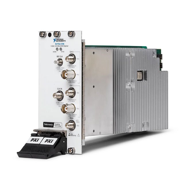 The PXIe‑5186 high-speed PXI oscilloscope has two channels with flexible settings for coupling, voltage range, and filtering. PXI oscilloscopes also feature a number of triggering modes, deep onboard memory, and an instrument driver that includes data streaming and analysis functions. This device is ideal for applications with fast signals that require up to 5 GHz of analog bandwidth and flexible measurement configurations. The PXIe‑5186 also features PXI synchronization and data streaming capabilities.