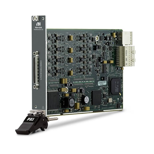 The PXIe‑6356 is a simultaneous-sampling, multifunction data acquisition device. It offers analog I/O, digital I/O, four 32‑bit counters, and analog and digital triggering. Onboard NI‑STC3 timing and synchronization technology delivers advanced timing functionality, including independent analog and digital timing engines and retriggerable measurement tasks. The PXIe‑6356 is ideal for a variety of applications, such as IF digitization; transient recording; ISDN, ADSL, and POTS manufacturing test in the telecom industry; ultrasound and sonar testing; and high-energy physics. The included NI‑DAQmx driver and configuration utility simplify configuration and measurements.