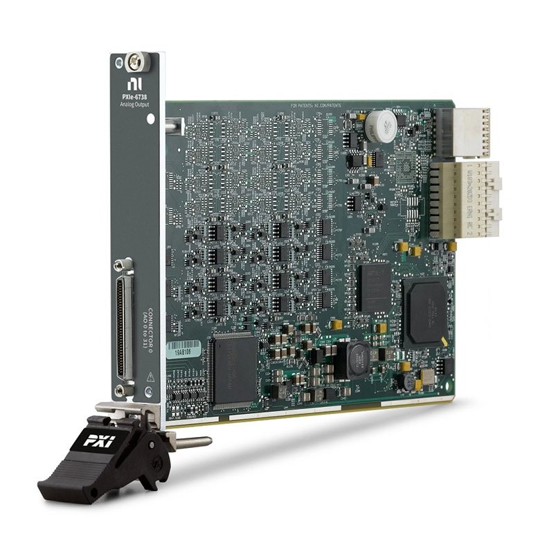 The PXIe‑6738 is a high-density analog output module. The device is ideal for applications such as stimulus-response tests and open-loop simulations at high densities. You can achieve the maximum sample rate if using up to eight channels, where each channel is on a separate bank. The PXIe‑6738 also includes 10 digital I/O lines, four counter/timers, digital triggering, and advanced timing to meet a wide range of application requirements. Its digital triggering and PXI Express synchronization capabilities allow it to be coupled with additional data acquisition, motion, and vision products to create highly custom measurement solutions to test innovative designs.