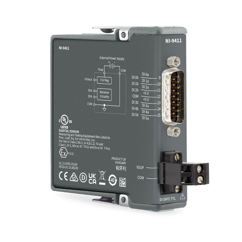 The NI‑9411 works with industrial logic levels and signals for direct connection to a wide array of industrial switches, transducers, and devices. The NI‑9411 is a correlated digital module, so it can perform correlated measurements, triggering, and synchronization when installed in a CompactDAQ chassis.