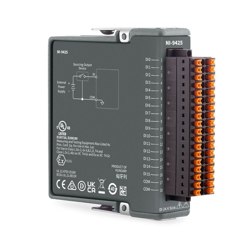 The NI‑9425 works with industrial logic levels and signals to connect directly to a wide array of industrial switches, transducers, and devices. Each digital input line is compatible with 24 V logic levels. The NI‑9425 offers isolation between the input and output banks from channel to earth ground. You cannot use the NI‑9425 in a CompactDAQ chassis to perform counter operations.