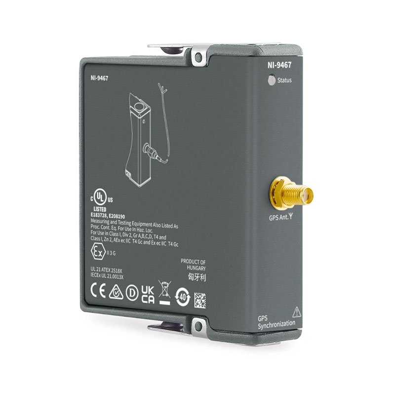 The NI‑9467 provides accurate time synchronization for CompactRIO systems. It returns stationary global position after self-survey, but it does not work for mobile applications. System designers can use this module for accurate data timestamping, system clock setting, gating data acquisition based on the arrival of the PPS, and synchronizing global waveform acquisition data using the FPGA. Test engineers can use this module for large-scale distributed applications such as bridge and large building structural health monitoring systems, electrical grid phasor measurement units (PMUs), wind farm monitoring systems, and power quality analysis systems. The NI‑9467 is compatible with only CompactRIO systems.